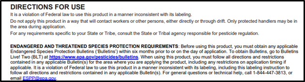 If required to review Bulletins Live! Two (BLT), the pesticide label will have language similar to this under the Directions for Use section.